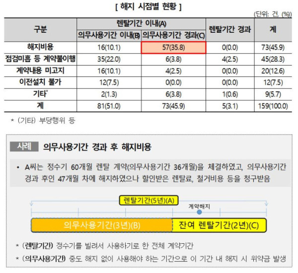 렌탈기간과 의무사용 기간이 확인되는 159건을 분석한 결과, 해지 비용과 관련해 '의무사용 기간 경과 후' 불만이 35.8%(57건)로 '의무사용 기간 내'(10.1%, 16건)보다 세 배 이상 많았다. 소비자원 관계자는 "이는 의무사용 기간 경과 후 해지 시, 소비자들은 위약금 등 부담해야 하는 비용이 없다고 예상한다"며 "실제로는 위약금만 제외될 뿐 할인받은 렌탈료, 등록비, 철거비 등이 청구되기 때문으로 풀이된다"고 설명했다.