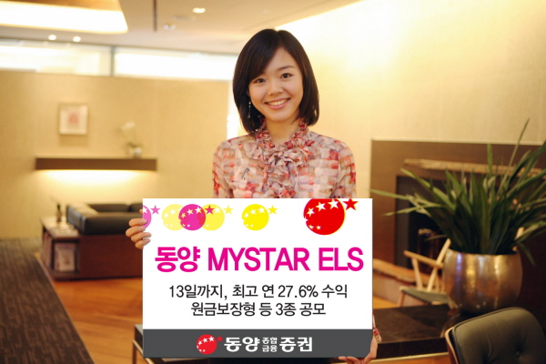 동양종합금융증권은 오는 13일까지 원금보장형 및 조기상환형 파생결합증권인 ‘동양 MYSTAR ELS’ 3종(280~282호)을 총 300억원 규모로 공모한다고 밝혔다.