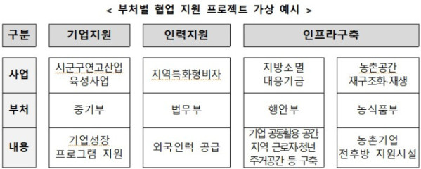 지역혁신프로젝트는 기초자치단체가 지방소멸 대응 전략을 수립하면, 4개 부처가 공동으로 선발하고 기업지원, 외국인력 공급, 인프라 구축 등 부처별 정책수단을 연계해 시너지 효과 창출을 목표로 한다..