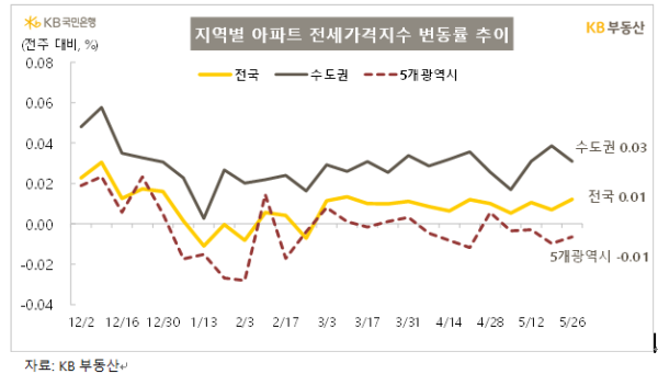 30일 KB부동산 통계 따르면 이번 주 수도권 아파트 전셋값은 0.03% 올랐다. 서울(0.05%), 경기(0.02%), 인천(0.03%) 모두 상승 기록이다. 수도권 상승률은 전주(0.04%) 대비 소폭 줄었지만 상승세는 여전하다.