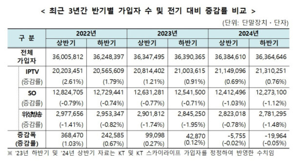 최근 3년간 인터넷 멀티미디어 방송(IPTV) 가입자 수는 꾸준히 증가하였으나, 종합유선방송(SO)과 위성방송 가입자 수는 지속 감소해 2024년도 하반기 기준 가입자 수는 인터넷 멀티미디어 방송(IPTV) 21,310,251 가입자(58.6%), 종합유선방송(SO)은 1227만 3100 가입자(33.75%), 위성방송은 278만 1295 가입자(7.65%)로 나타났다.