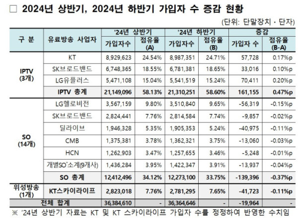 과학기술정보통신부는 30일 2024년도 하반기 유료방송 가입자 및 시장점유율을 발표했다. 지난해 하반기 유료방송 가입자는 3636만 4646 가입자로, 지난 분기 감소 폭(0.02%) 대비 감소 폭이 확대됐다.