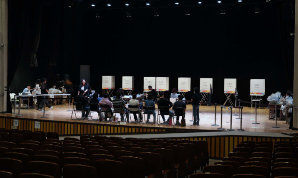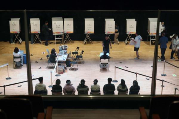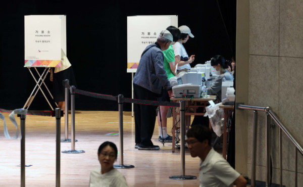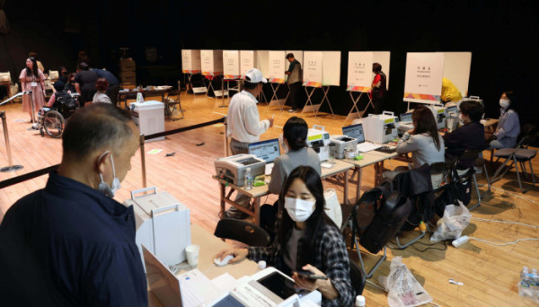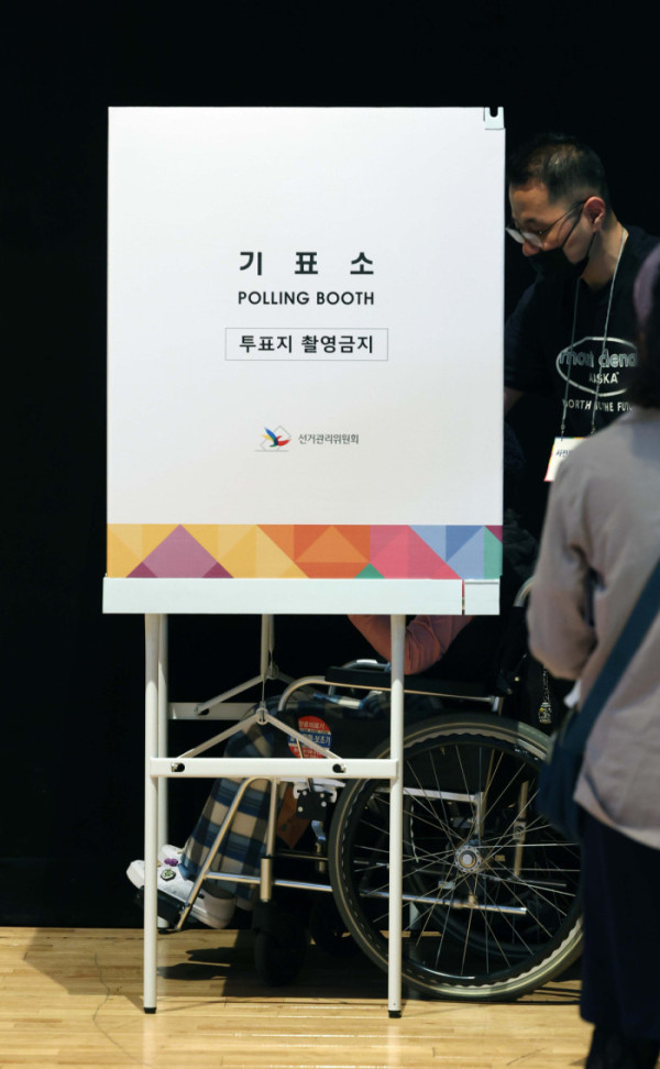 제21대 대통령선거 사전투표 이틀째인 30일 서울 구로구 구로구민회관에 마련된 사전투표소를 찾은 유권자들이 투표를 하고 있다.