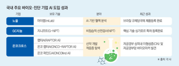 1일 본지 취재를 종합하면 노을, GC지놈, 온코크로스 등이 최근 혈액 검체로 AI 기반 분석 사업을 확대하고 있다. 산전 검사나 질병 진단 서비스를 개발해 국내외에서 허가 및 특허권을 확보하며 시장 공략에 속도를 내고 있다.