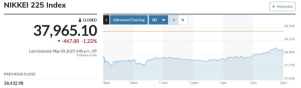 이날 오전 일본 증시는 개장과 함께 미국 연방항소법원이 트럼프 행정부의 관세정책과 관련해 유효하다는 판단을 내리면서 하락 출발했다. 전날 미국 연방국제통상법원은 트럼프 대통령의 관세 정책이 의회를 거치지 않은 위법한 행정명령이라며 관세 효력 정지를 판결했다.