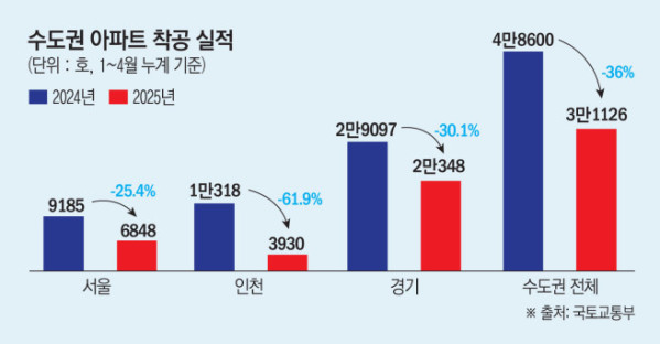 같은 기간 수도권 착공 물량은 3만1126호로 36% 줄었다. 전국 평균보다 감소율은 다소 낮지만 절대적인 감소 폭만 놓고 보면 1만7000호 이상 줄며 전국 착공 위축의 핵심 원인으로 작용했다. 지역별로는 인천이 3930호로 전년 동기(1만318호)보다 61.9% 줄며 수도권 내에서도 가장 큰 감소 폭을 기록했다. 경기도는 2만348호로 30.1%, 서울은 6848호로 25.4% 줄었다.