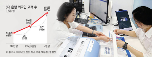 1일 금융권에 따르면 5대 은행(KB국민·신한·하나·우리·NH농협)에서 계좌를 개설한 외국인 고객 수는 4월 말 기준 651만8656명으로 집계됐다.