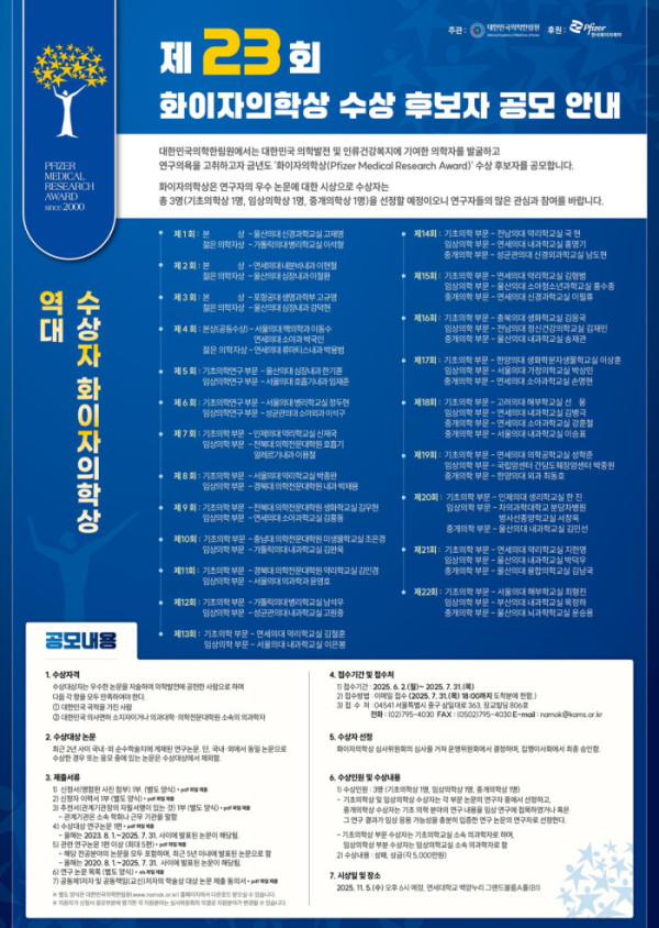 대한민국의학한림원과 한국화이자제약은 7월 31일까지 제23회 화이자의학상(Pfizer Medical Research Award) 수상자 후보를 공모한다고 2일 밝혔다.