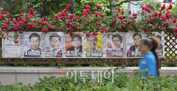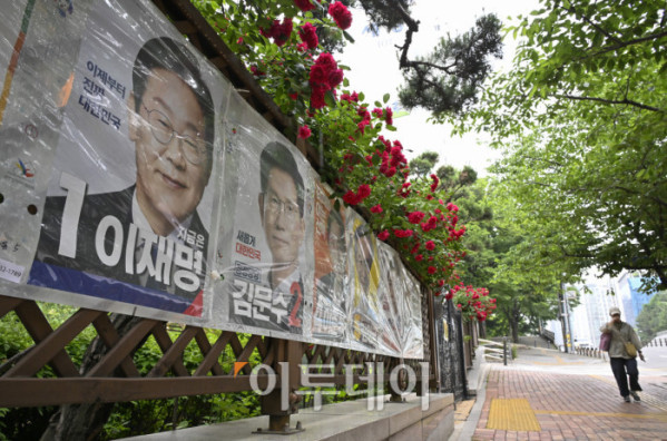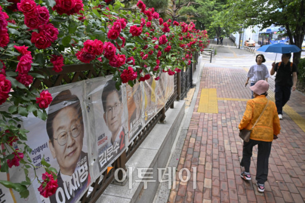 ▲제21대 대통령선거를 하루 앞둔 2일 서울 시내의 한 아파트 화단에 심어진 장미꽃 밑으로 대선 선거벽보가 게시돼 있다. 제21대 대선 본투표는 3일 오전 6시부터 오후 8시까지 전국 투표소 1만4295곳에서 치뤄진다. 한편 이날 이재명 더불어민주당 대선 후보와 김문수 국민의힘 대선 후보 모두 서울에서 마지막으로 유권자를 만난다. 이재명 후보는 여의도공원에서, 김문수 후보는 서울시청 앞 광장에서 피날레 유세를 펼칠 예정이다. 이준석 개혁신당 대선 후보는 대구 수성구 수성못 일대에서, 권영국 민주노동당 대선 후보는 종로구 보신각에서 유세를 마무리 한다. 조현호 기자 hyunho@