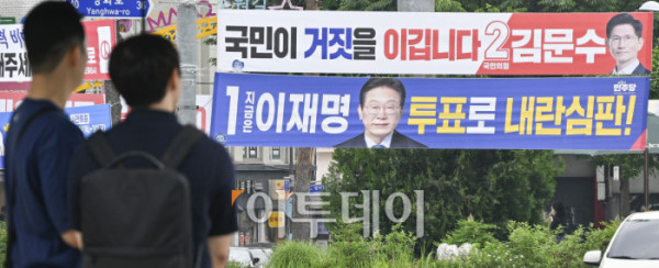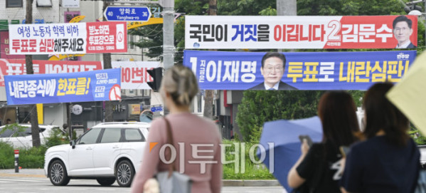 ▲제21대 대통령선거를 하루 앞둔 2일 서울 시내의 한 거리에 각 정당 대선 후보 홍보 현수막이 게시돼 있다. 제21대 대선 본투표는 3일 오전 6시부터 오후 8시까지 전국 투표소 1만4295곳에서 치뤄진다. 한편 이날 이재명 더불어민주당 대선 후보와 김문수 국민의힘 대선 후보 모두 서울에서 마지막으로 유권자를 만난다. 이재명 후보는 여의도공원에서, 김문수 후보는 서울시청 앞 광장에서 피날레 유세를 펼칠 예정이다. 조현호 기자 hyunho@