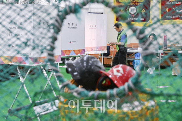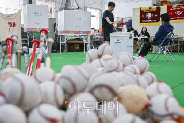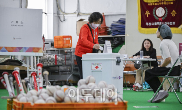 제21대 대통령선거 본투표일인 3일 서울 중구 청구초등학교 야구부실내훈련장에 마련된 청구동제1투표소에서 시민들이 투표를 하고 있다. 이날 대선 본투표는 오전 6시부터 오후 8시까지 전국 1만4295개 투표소에서 진행된다. 조현호 기자 hyunho@