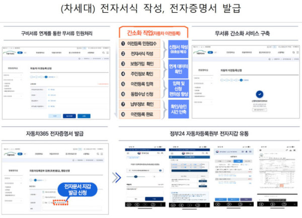 특히 신규, 이전 등 자동차 등록 민원을 서류 없이 전자서식으로 간편하게 처리할 수 있고 자동차등록증 등 10종의 민원서류를 전자문서지갑으로 발급받을 수 있다.
