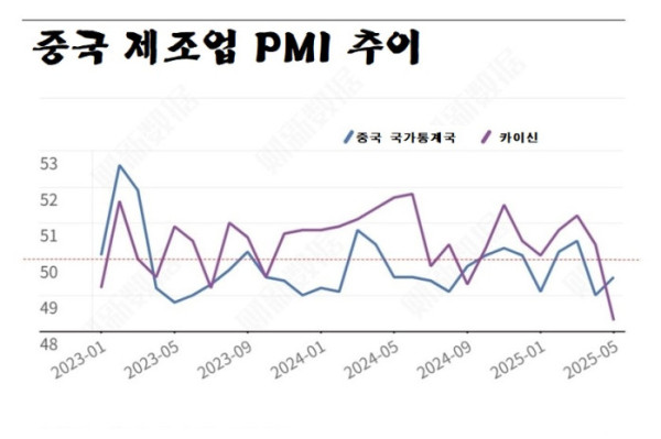앞서 차이신은 5월 제조업 PMI를 전월(50.4)보다 소폭 상승한 50.7로 전망했다. 반면 지수가 하락하면서 2022년 9월 이후 32개월 만에 최저치에 머물렀다. 차이신에 따르면 신규 수출 주문 지수는 두 달 연속 감소했고 지난달 낙폭은 2023년 7월 이후 최대폭이었다. 이는 미국의 고관세가 제조 강국인 중국에 직접적인 타격을 주기 시작했음을 보여준 것으로 풀이된다.