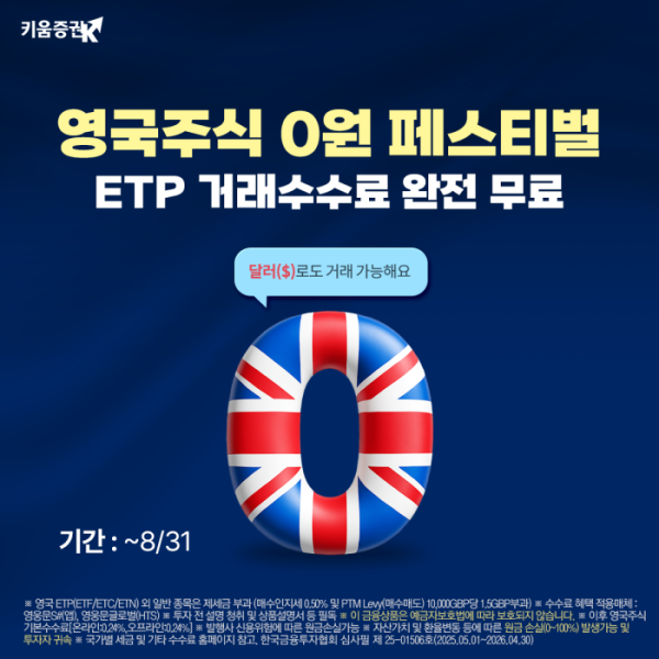 키움증권은 오는 8월 말까지 영국주식 ETP(ETF·ETC·ETN) 거래 수수료를 전면 무료로 제공한다.