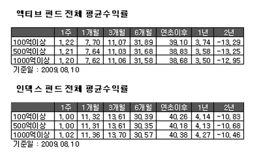 운용사 한 관계자는 "단기적으로 주식시장을 이끈 종목이 포함된 액티브펀드의 수익률이 호조를 보이지만, 중장기적으로는 시장수익률을 추종하며 보수 경쟁력을 갖춘 인덱스펀드 역시 투자매력이 높다고 볼 수 있다"고 말했다.