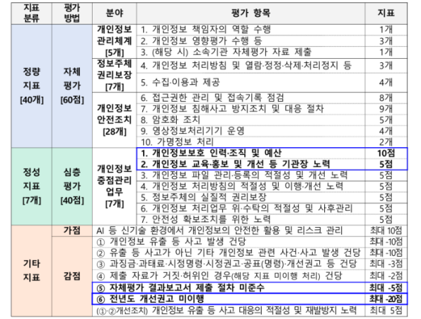 보호수준 평가는 법적 의무사항 준수 여부 등 정량지표 중심의 자체평가(60점)와 개인정보 보호 업무 추진 내용의 적절성·충실성을 반영한 정성지표 중심의 전문가 평가단 심층평가(40점)로 구성된다.