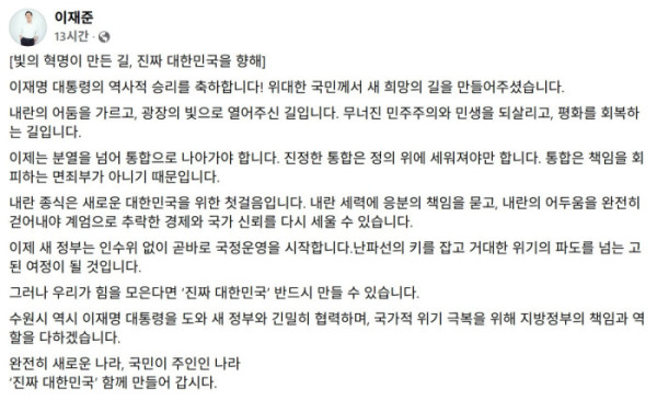 이 시장은 이번 승리를 "내란의 어둠을 걷고 광장의 빛으로 열어낸 길”이라고 표현하며 민주주의와 민생의 회복, 평화 정착의 시작으로 평가했다.