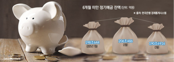 4일 은행연합회에 따르면 예금은행의 6개월 미만 정기예금 잔액은 올해 3월 말 기준 190조6916억 원으로 집계됐다. 이는 전월(206조486억 원)보다 15조3570억 원(7.5%) 줄어든 수치다.