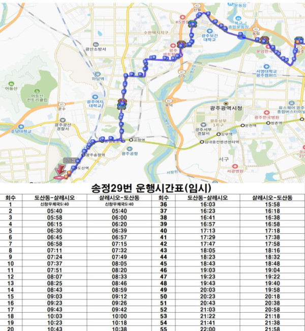 이에 따라 순환01번은 오전 6시 30분부터 15분 간격으로, 좌석02번은 오전 6시부터 35분 간격으로, 수완03번은 오전 6시 30분부터 20분 간격으로 운행된다. 매월06번은 오전 6시 30분부터 25분 간격으로 운행되며, 이 외의 노선들도 일부 시간표를 조정해 제한적으로 운행에 나선다.