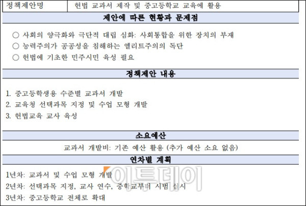 정책제안 내용은 △중고등학생용 수준별 교과서 개발 △교육청 선택과목 지정 및 수업 모형 개발 △헌법 교육 교사 육성 등이다.