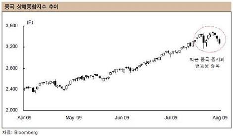 8월 들어 중국 상하이종합지수는 단기 급등에 따른 피로감과 은행감독관리위원회의 은행권 후순위채 발행 제한, IPO 재개에 따른 물량 부담감, 신규대출 감소 전망 등으로 3500선 고지를 앞두고 숨고르기 장세를 연출하고 있다.