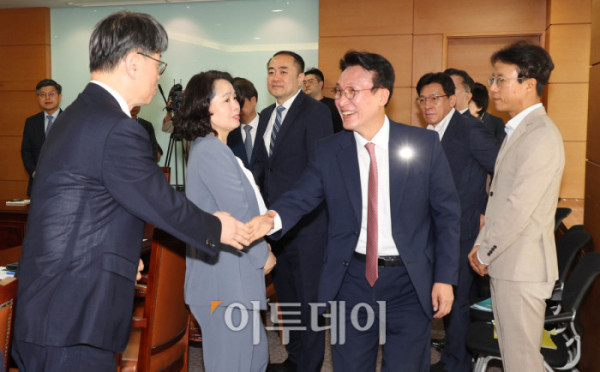▲김민석 국무총리 후보자가 5일 서울 종로구 금융감독원 연수원에 마련된 인사청문회 준비 사무실에서 간부들과 인사하고 있다. 조현호 기자 hyunho@