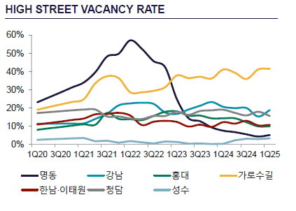 성수 지역은 공실률이 전분기와 비슷한 수준을 유지하며 안정세를 보였다. 과거 팝업스토어 중심의 임시 매장 문화에서 최근 정규 플래그십 스토어 출점이 확산되며 상권 전환기에 접어들었다.