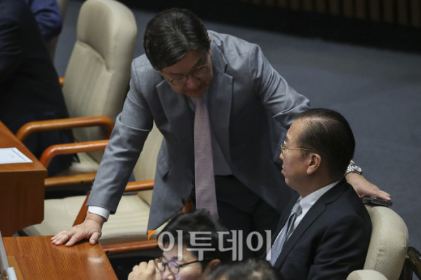 ▲국민의힘 권성동(왼쪽) 전 원내대표와 권영세 전 비상대책위원장이 5일 서울 여의도 국회에서 열린 본회의에서 대화를 하고 있다. 조현호 기자 hyunho@