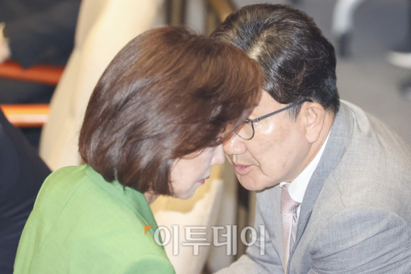 ▲국민의힘 권성동(오른쪽) 전 원내대표와 나경원 의원이 5일 서울 여의도 국회에서 열린 본회의에서 대화를 하고 있다. 조현호 기자 hyunho@