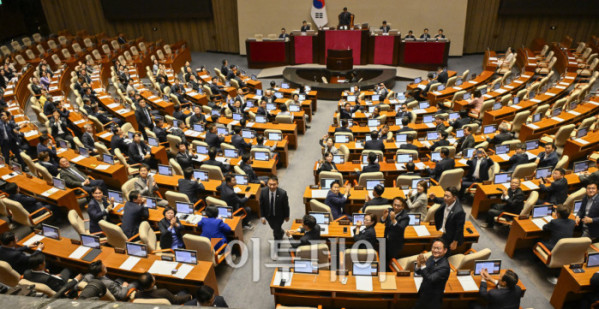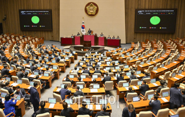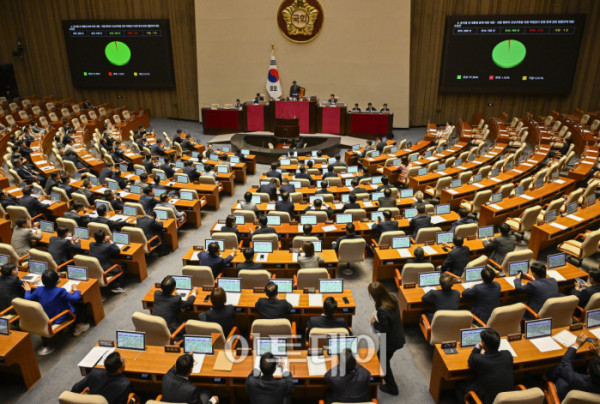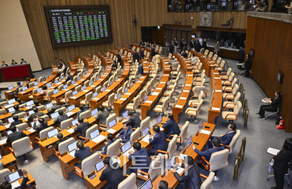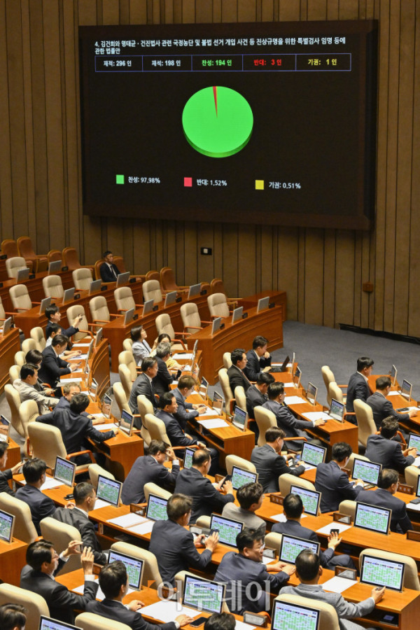 ▲5일 서울 여의도 국회에서 열린 본회의에서 김건희와 명태균ㆍ건진법사 관련 국정농단 및 불법 선거 개입사건 등 진상규명을 위한 특별검사 임명 등에 관한 법률안이 통과되고 있다. 조현호 기자 hyunho@