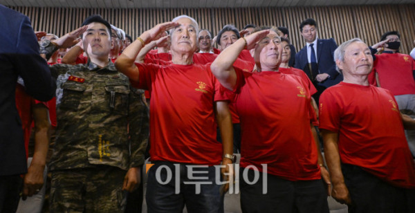 ▲5일 서울 여의도 국회에서 열린 본회의에서 순직 해병 수사 방해 및 사건 은폐 등의 진상규명을 위한 특별검사의 임명 등에 관한 법률안이 통과되자 방청을 온 해병대 예비역 연대 회원들이 경례를 하고 있다. 조현호 기자 hyunho@