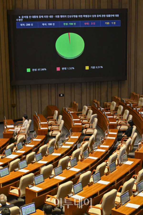5일 서울 여의도 국회에서 열린 본회의에서 윤석열 전 대통령 등에 의한 내란ㆍ외환 행위의 진상규명을 위한 특별검사 임명 등에 관한 법률안이 통과되고 있다. 조현호 기자 hyunho@