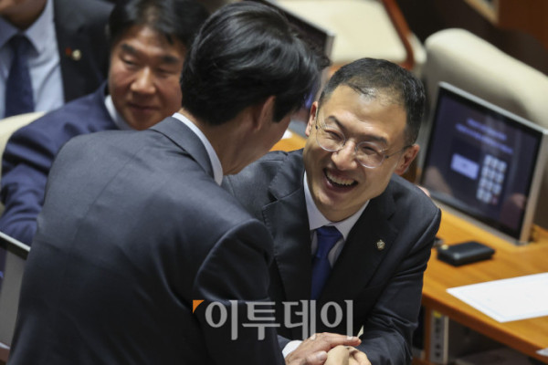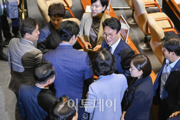 ▲더불어민주당 소속 김민석 국무총리 후보자가 5일 서울 여의도 국회에서 열린 본회의에서 의원들과 인사를 나누고 있다. 조현호 기자 hyunho@