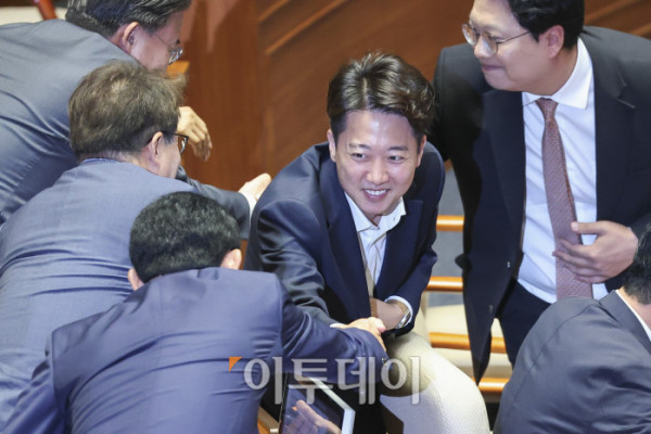 ▲이준석 전 개혁신당 대선 후보가 5일 서울 여의도 국회에서 열린 본회의에 참석하며 의원들과 인사하고 있다. 조현호 기자 hyunho@