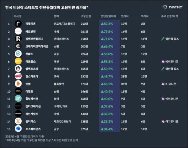 전반적인 고용시장 한파 속에서도 고용 인원 규모가 크게 증가한 스타트업들도 있다. 특히 작년 12월 사피온과의 인수합병을 완료하며 사명을 변경한 리벨리온은 합병 영향으로 고용 인원이 크게 늘었다. 대표작 ‘나이트 크로우’의 흥행으로 실적 고공행진을 기록한 매드엔진이나 올해 공격적으로 사업을 확장하겠다고 밝힌 리멤버앤컴퍼니처럼 고용 규모가 꾸준히 증가 중인 스타트업도 눈에 띈다. 이 외에도 한패스, 라포랩스 등이 고용 증가세를 보였다.