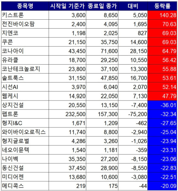 이밖에 쿠콘(69.03%), 코나아이(64.79%), 유라클(56.42%), 코난테크놀로지(55.88%), 솔트룩스(53.61%), 시선AI(52.14%), 웹케시(47.79%) 등이 상승률 상위권을 기록했다.