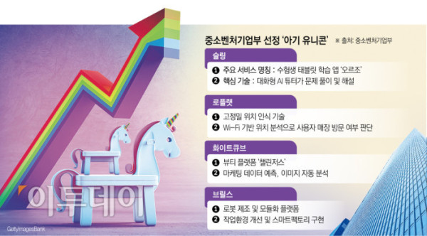 업계 관계자는 “아기유니콘에 선정된 스타트업들은 투자시장에서 기술력과 성장성을 인정받은 기업들”이라며 “향후 글로벌 진출을 위한 사업 추진과 후속 투자유치에도 속도가 붙을 것”이라고 말했다.