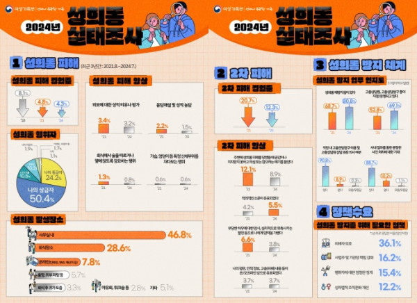 여가부는 "코로나19 이후 다시 이전의 대면 중심 근무 방식으로 돌아오는 경향이 있어 피해 경험률 상승에 영향을 미친 것으로 분석된다"라고 설명했다.