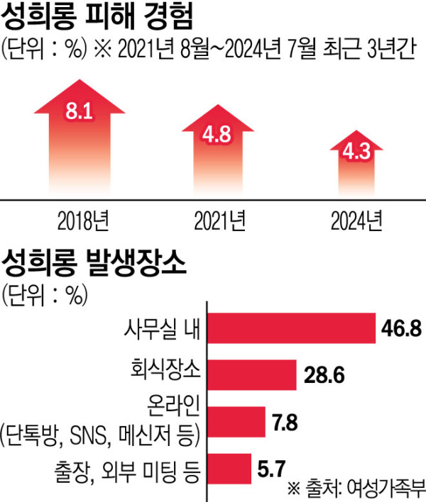 9일 여성가족부가 발표한 '2024년 성희롱 실태조사' 결과에 따르면 지난 3년간 직장에서 재직하는 동안 본인이 한 번이라도 성희롱 피해를 경험한 사람은 전체 응답자의 4.3%였다. 직전 조사인 2021년 4.8%에 비해 0.5%포인트(p) 감소했다.