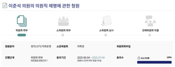 9일 오전 10시 22분 기준 국회 국민동의청원 게시판에 올라온 ‘이준석 의원의 의원직 제명에 관한 청원’은 41만 2703명의 동의를 얻었다.