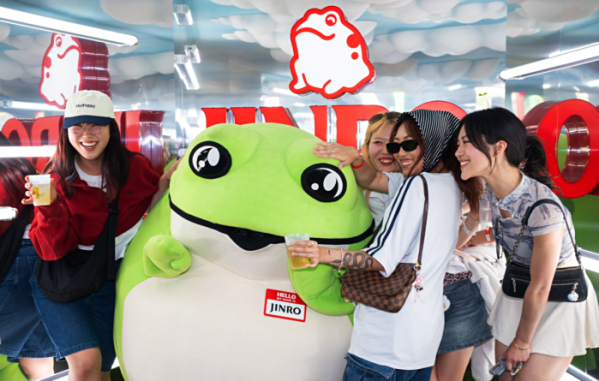 ▲5월 31일부터 6월 1일까지 미국 로스앤젤레스(LA)에서 열린 '헤드 인 더 클라우즈 2025'의 진로 부스를 찾은 미국인들이 진로 두꺼비 캐릭터와 함께 즐거운 시간을 보내고 있다. (사진제공=하이트진로)