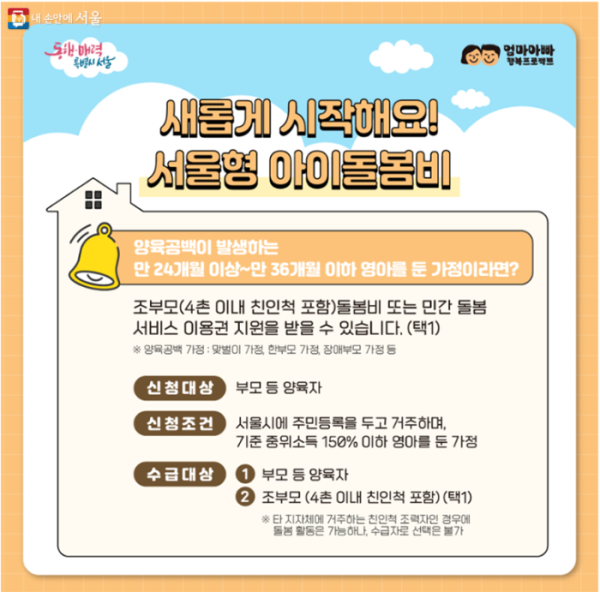 ‘서울형 아이돌봄비’는 서울에 거주하는 2세 영아(24개월부터 36개월 사이) 양육가정 중 부모가 직접 아이를 돌보기 어려운 가정에 월 일정 금액의 조부모(4촌 이내 친인척 포함) 조력자 아이돌봄비 또는 민간 돌봄서비스 기관 이용비를 지원하는 제도입니다.