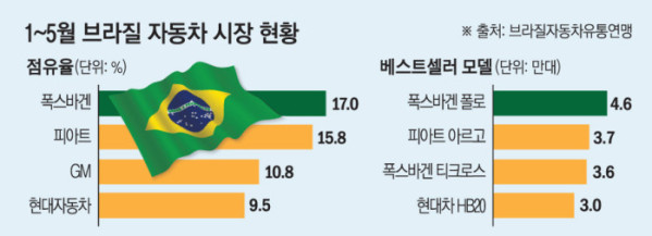 현대차는 2012년 현지 법인(HMB)과 브라질에 공장을 세우면서 남미 시장에 본격적으로 진출했다. 특히 현지 특화 모델로 사탕수수에서 추출이 가능한 에탄올과 휘발유를 섞은 혼합연료차량(FFV) ‘HB20’와 도로 사정을 고려한 소형 스포츠유틸리티차량(SUV) ‘크레타’를 내세워 현지에서 장악력을 키우고 있다. HB20은 올해 1~5월 기준 2만9957대가 판매돼 판매량 4위를 기록했으며, 크레타(2만4763대)는 8위에 오르는 등 실적을 견인했다.