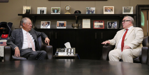 ▲류진 한국경제인협회 회장(왼쪽)이 10일 충정로 풍산빌딩을 방문한 왓슨경 영국 무역특사를 만나 주요 현안과 양국 경제협력 방안에 대해 논의하고 있다. (사진= 한경협 )