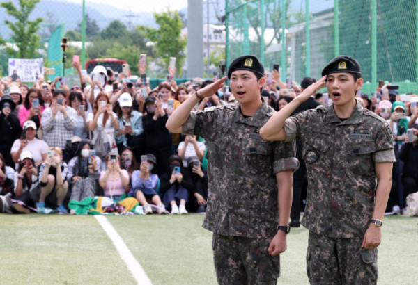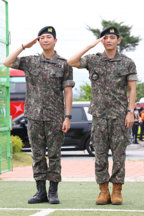 방탄소년단(BTS) RM(김남준)과 뷔(김태형)가 10일 오전 육군 현역 복무를 마치고 나란히 전역했다. RM은 제15보병사단 군악대, 뷔는 제2군단 군사경찰 특수임무대에서 각각 복무했다. 이날 색소폰을 들고 자축연주를 하는 RM의 모습도 눈길을 끌었다. 두 사람은 각각 팬들 앞에서 필승과 충성을 외치며 전역을 신고했다. 한편, 11일에는 지민(박지민)과 정국(전정국)이 전역을 앞두고 있으며, 사회복무요원으로 복무 중인 슈가(민윤기)는 21일 소집해제된다.