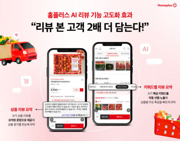 홈플러스 온라인몰은 리뷰 시스템에 인공지능(AI) 기술을 고도화한 이후, 상품 정보를 확인한 고객의 장바구니 전환율이 평균 대비 약 2배 증가한 것으로 나타났다고 10일 밝혔다.