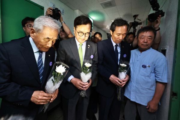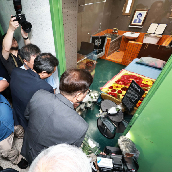 ▲10일 서울 용산구 민주화운동기념관에서 열린 제38주년 6·10민주항쟁 기념식을 마친 우원식 국회의장, 우상호 대통령실 정무수석, 이재오 민주화운동기념사업회 이사장이 대공분실 509호를 찾아 헌화하고 있다. 신태현 기자 holjjak@
