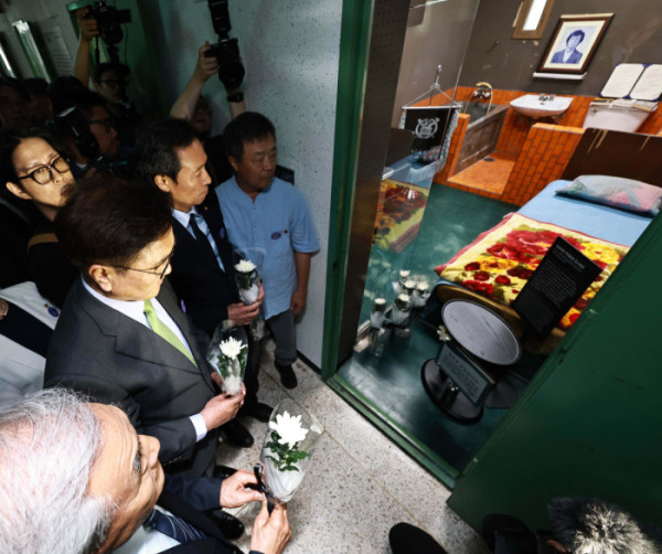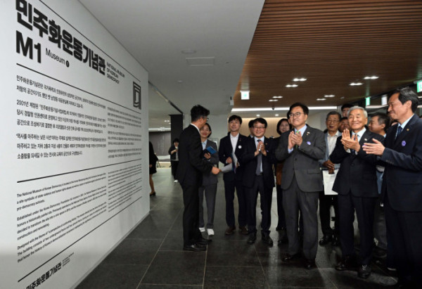 ▲우원식 국회의장과 이재오 민주화운동기념사업회 이사장, 우상호 대통령실 정무수석 등 참석자들이 10일 서울 용산구 민주화운동기념관을 둘러보며 박수를 치고 있다. 신태현 기자 holjjak@