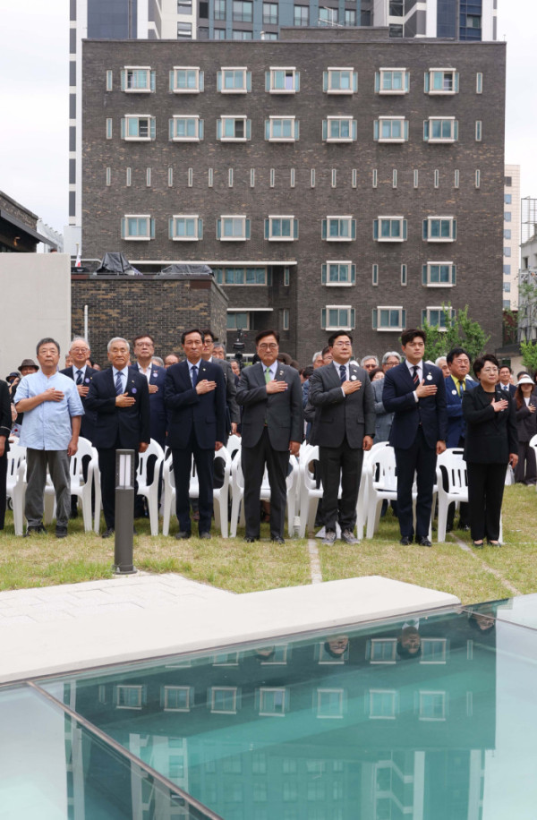 ▲10일 서울 용산구 민주화운동기념관(옛 남영동 대공분실)에서 열린 ‘제38주년 6·10 민주항쟁 기념식 및 민주화운동기념관 개관식’에서 우원식 국회의장, 박찬대 더불어민주당 대표 직무대행 겸 원내대표, 김용태 국민의힘 비상대책위원장, 우상호 대통령실 정무수석, 이재오 민주화운동기념사업회 이사장 등이 국민의례를 하고 있다. 신태현 기자 holjjak@