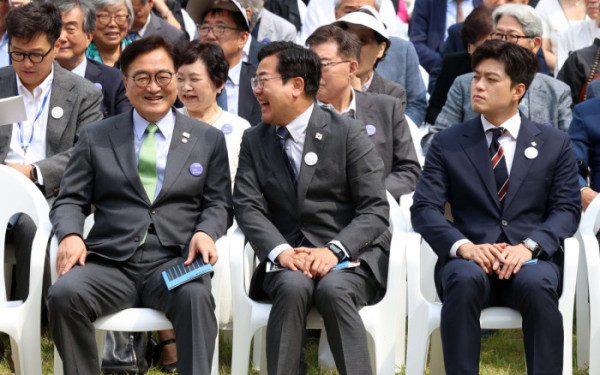 ▲10일 서울 용산구 민주화운동기념관(옛 남영동 대공분실)에서 열린 ‘제38주년 6·10 민주항쟁 기념식 및 민주화운동기념관 개관식’에서 우원식(왼쪽) 국회의장과 박찬대 더불어민주당 대표 직무대행 겸 원내대표가 대화를 하고 있다. 오른쪽은 김용태 국민의힘 비상대책위원장. 신태현 기자 holjjak@